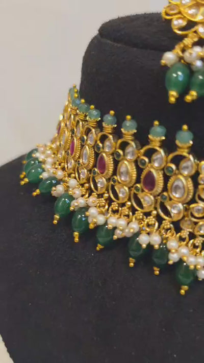 Elegant Kundan choker with matte gold finish, perfect for traditional occasions. Intricate design adds timeless charm.
