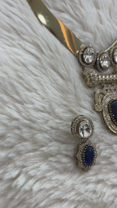Deep blue stone centerpiece, kundan artistry and bold earrings—an enchanting pick for evening glam.