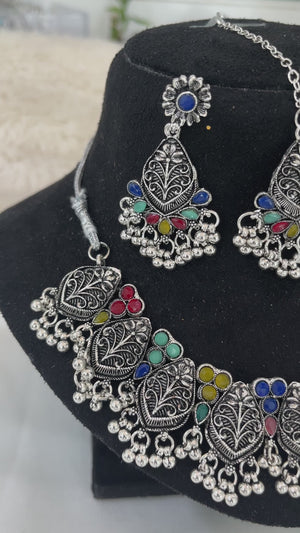 Color stone‑studded oxidised choker with earrings and maang tikka—vibrant ethnic flair.