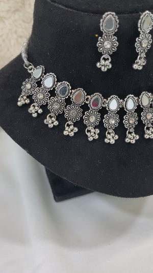 Oxidised silver mirror‑work choker with floral accents and earrings. Bold boho statement for fusion fits.