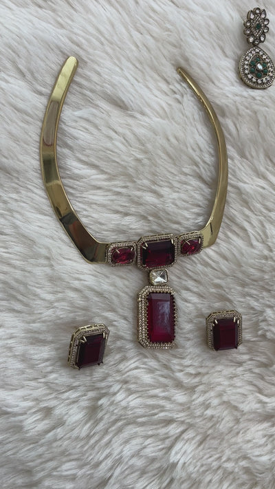 Gold‑plated hasli with large ruby stones bordered by shimmering crystals—a bold royal statement.
