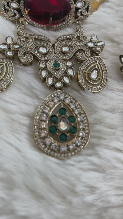 Bold ruby centerpiece with emerald‑studded earrings and intricate kundan work—perfect for grand elegance.